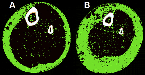 Box 3 – Transverse peripheral quantitative computed tomography images of the mid-calf highlighting IMAT in age- and BMI-matched obese older women (A) without and (B) with type 2 diabetes*