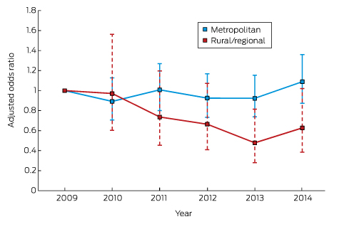 * The reference year is 2009. Estimates and 95% confidence intervals can be compared with the reference year, but not between rural/regional and metropolitan locations.