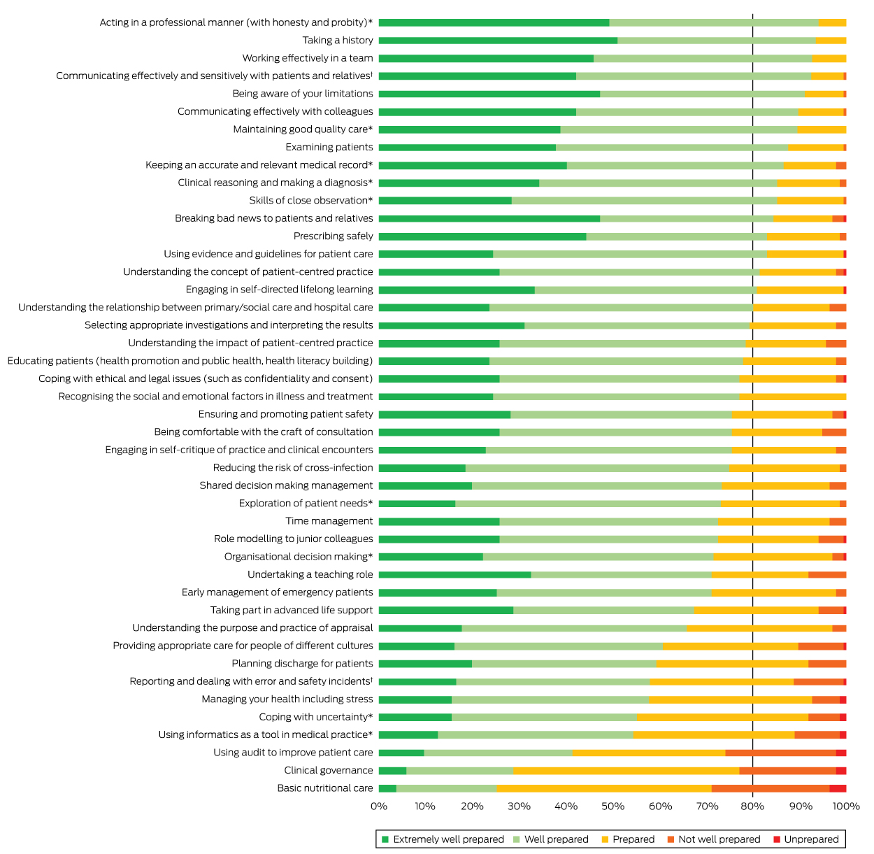 Limitations to our study include the fact that respondents’ reflections on their experiences and the expectations they faced in earlier years may have caused recall bias. It is also possible that doctors further out from graduation have different perceptions of preparedness because of their greater experience working in health care. This study is also limited by its being a single site study in a regional university with small graduate numbers, meaning that its results may not be generalisable to other medical schools. Respondents’ interpretation of what constitutes preparedness for each item may also have varied, given that there were no objective criteria for graduates to benchmark their own preparedness.1,15 The judgements of graduates cannot be assumed to be equivalent, although it is likely that each graduate applied similar judgements to each of the 44 items.