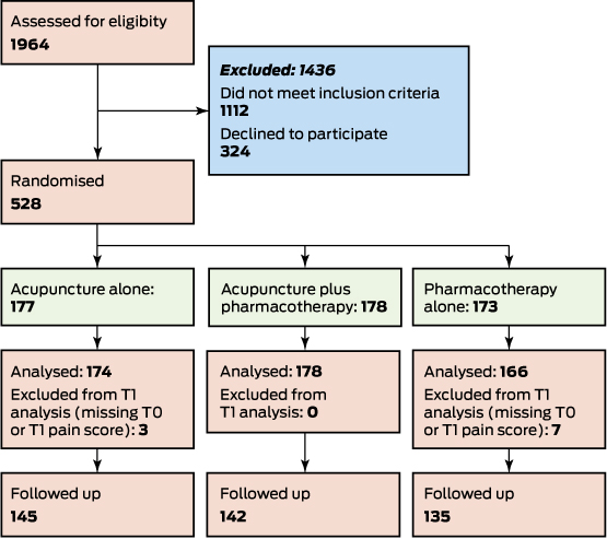 The study was a pragmatic, multicentre, single blinded, randomised, controlled trial comparing the effects of acupuncture, pharmacotherapy, and combined acupuncture and pharmacotherapy for treating patients presenting to EDs with ankle sprain, migraine or lower back pain. It was undertaken in four large tertiary hospitals in Melbourne — two public EDs (the Northern Hospital and the Alfred Hospital Emergency and Trauma Centre) and two private EDs (the Epworth and Cabrini Hospitals) — between January 2010 and December 2011. The full protocol of the trial has been reported previously.18
