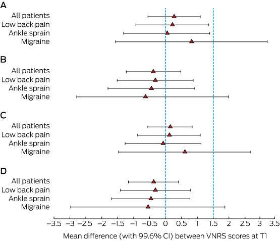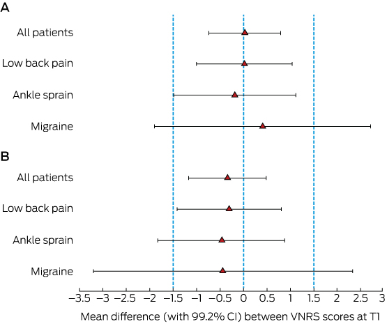 Setting, participants: Patients presenting to emergency departments in one of four tertiary hospitals in Melbourne with acute low back pain, migraine, or ankle sprain, and with a pain score on a 10-point verbal numerical rating scale (VNRS) of at least 4.