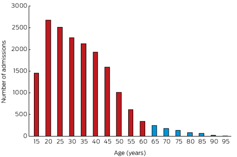 Changes in the epidemiology of the admissions of older patients over the 26-year period were analysed by dividing it into one 6-year and four 5-year segments. The proportion of patients admitted to hospital for self-poisoning who were 65 or older (3–4%) was relatively constant across the entire period. The median age of the older patients was 73 years (IQR, 68–79 years); that of the younger patients was 31 years (IQR, 23–41 years). There was a steady decline in the number of admissions for overdoses with increasing age (Box 1). Five hundred admissions in the older cohort (80%) and 14 837 in the younger cohort (89%) involved deliberate self-poisoning (P < 0.001). While the absolute number of self-poisonings decreased with age, the proportion of unintentional and iatrogenic poisoning admissions among patients over 65 increased (65–74 years, 15%; 75–84 years, 25%; 85–97 years, 34%; P < 0.001).