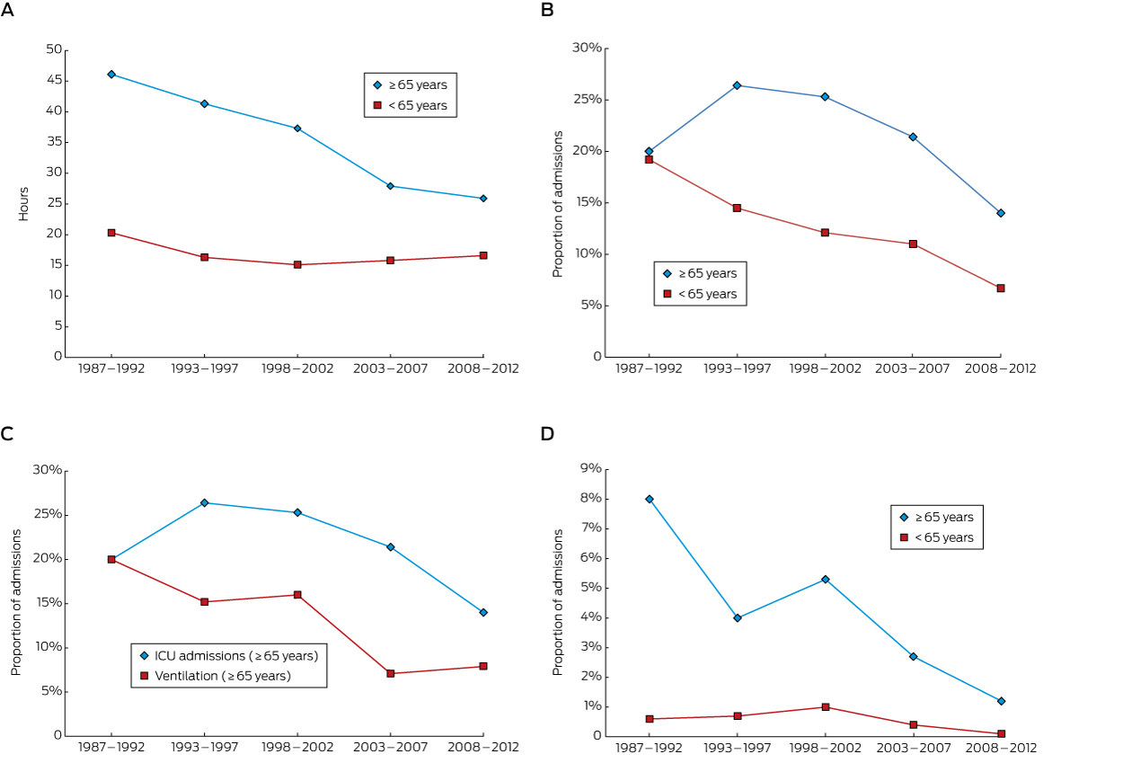 The median hospital LOS for the older patients across the entire period was 34 hours (IQR, 16–75 h); for the younger cohort, 16 hours (IQR, 9–25 h; P < 0.001). There was a progressive decline in LOS for the elderly cohort over the 26 years, from 46 hours (IQR, 23–86 h) in 1987–1992 to 26 hours (IQR, 14–35 h) in 2008–2012; in the younger cohort LOS was relatively constant across time (Box 2, A). The fall in LOS for older patients did not appear to be related to any change in self-poisoning rates with a particular class of drugs (data not shown).