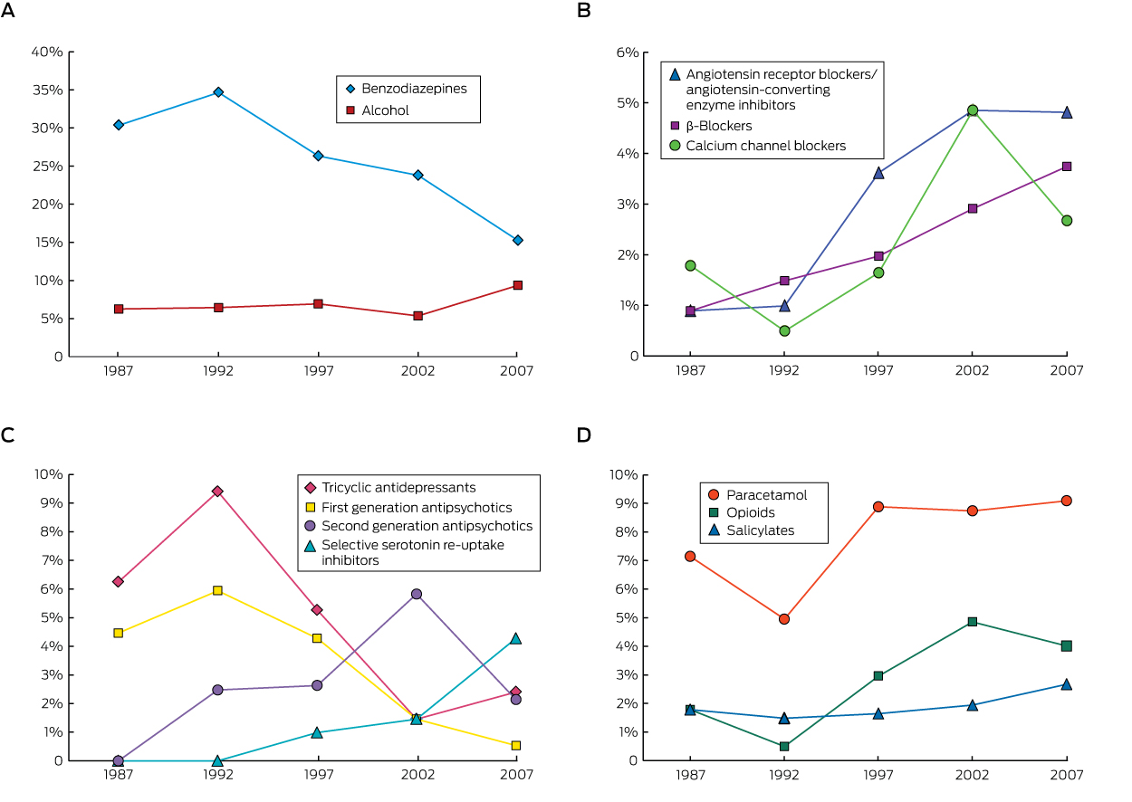 Benzodiazepines were the drugs most frequently implicated in self-poisonings by older patients in our study, consistent with other reports. A Canadian study of 2079 people aged 65 or more found that benzodiazepines, opioids, other analgesics and antipyretics, antidepressants, and sedative hypnotics were the drug classes most frequently used in suicide attempts.5 In a Swedish study, a benzodiazepine was implicated in 39% of drug poisoning suicides by older people, and this proportion was rising despite a reduction in prescription sales.14 Both the prescription and ingestion of benzodiazepines have been reported to be associated with self-poisoning by older Australians.9 Benzodiazepines may exacerbate undiagnosed depression and impair impulse control in some individuals, leading to suicide attempts. The decline in the proportion of admissions for self-poisoning with benzodiazepines over the study period is therefore reassuring.