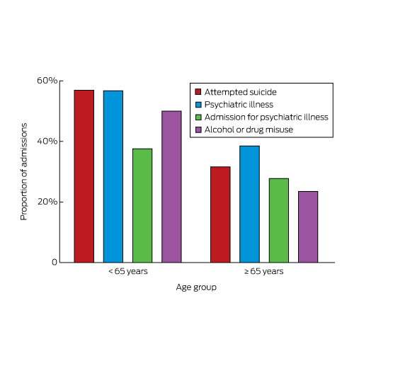 As our population ages, self-poisoning and the associated morbidity are likely to be a growing problem. Self-poisoning is a burden on the health system and is a risk factor for subsequent suicide.1 Drug overdose is less common among older people than in younger adults,2 but is associated with higher morbidity and mortality.3-5 Distinct age differences in the nature and severity of self-poisoning have been reported.5 Stressors such as failing health, the death of a spouse, family discord, and loneliness may contribute to poisoning in older people.6 They often have several comorbidities and consequently take numerous medications, providing a ready source of toxins for self-poisoning. Further, multiple comorbidities and frailty may exacerbate the toxicity of these agents and hamper recovery from self-poisoning. Hopelessness and suicidality frequently increase with age, and depression is strongly associated with suicidality in older people. There is also a relationship between medical and psychiatric comorbidities and suicide by older people.7