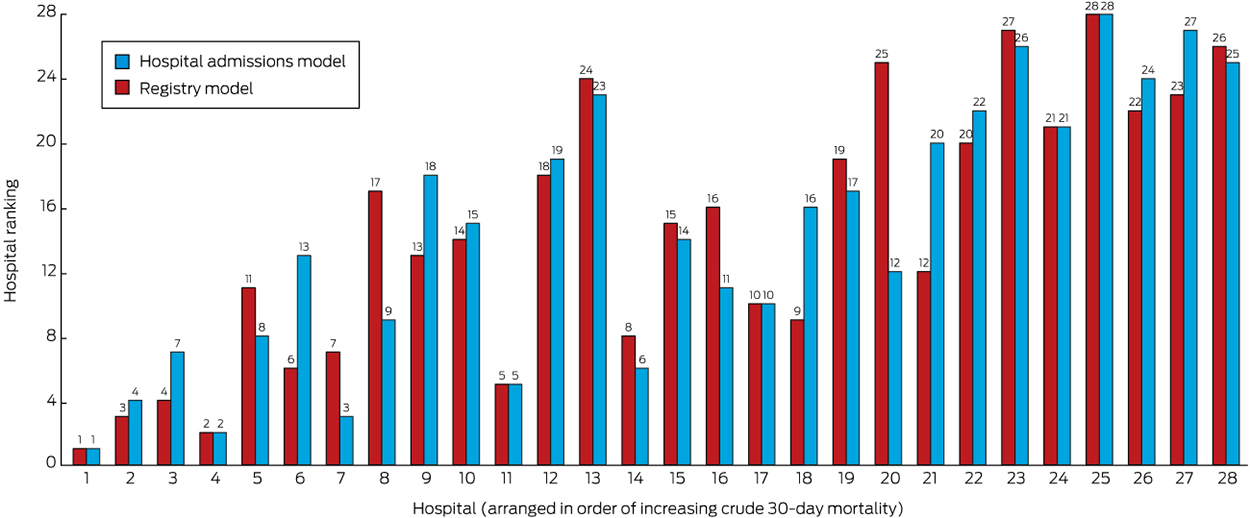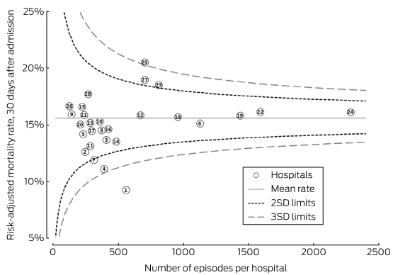 Our investigation has broader implications for Australia, in that it advances methods for hospital-level comparisons of risk-adjusted mortality, particularly on the basis of routinely collected registry data. We acknowledge, as a limitation of our study, that not all hospitals contribute data to AuSCR, and our findings may consequently not be generalisable to all hospitals. Further, our sample was restricted to hospitals reporting at least 200 episodes of care (10 084 episodes from 17 hospitals were therefore excluded from our analyses). Including all hospitals may have led to greater variance in our results, but our sample was broadly representative of the entire cohort (online Appendix 1). The overall crude 30-day death rate for eligible hospitals (with at least 200 episodes of care) was 15% (range, 7–23%), similar to reports from other countries (13–15%).4,17