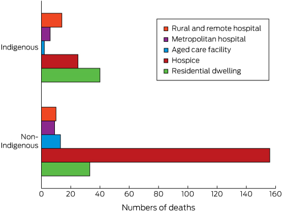The study sample included 308 people, of whom 121 (39%) were women and 87 (28%) were Indigenous Australians. The mean age at death was 60.9 years (standard deviation [SD], 11.7) for Indigenous people, and 71.4 years (SD, 12.3) for non-Indigenous people. A significantly greater proportion of Indigenous than of non-Indigenous deaths occurred in residential dwellings (unadjusted relative risk, 3.08; 95% confidence interval, 2.09–4.54; P < 0.001). All but two of 40 deaths of Indigenous people in residential dwellings were in rural or remote locations. Deaths in institutions accounted for 85% of non-Indigenous and 54% of Indigenous deaths (Box); 16% of Indigenous people who did not die in a residential dwelling died in a rural or remote hospital near or in their home community.