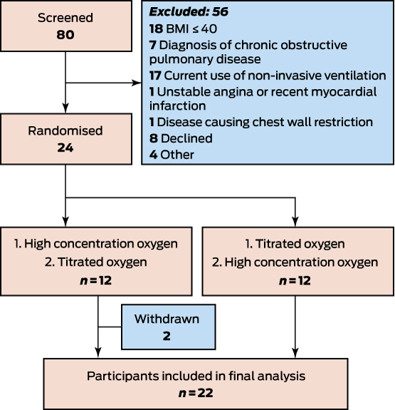 For this randomised crossover trial, we recruited 24 adult patients with a body mass index (BMI) exceeding 40 kg/m2 who had been admitted to Wellington Regional Hospital, New Zealand. Patients were excluded if they were under 16 years of age, had been diagnosed with COPD or a condition associated with restriction of chest wall expansion other than obesity, unstable angina or recent myocardial infarction, had a baseline Ptco2 greater than 65 mmHg, or were currently receiving non-invasive ventilation. Investigators could also exclude patients for any condition that might represent a safety risk or affect the feasibility of the study or its results.