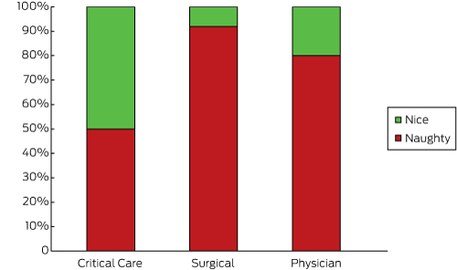 Results: The majority of doctors in only 19% of specialties made the Nice list. When aggregated, 92% of surgical specialties reported that they either never followed recipes or did so only occasionally. Similarly, 80% of physician specialties reported being Naughty. In contrast, 50% each of those in critical care specialties were Naughty or Nice. General practitioners comprised the largest single group of respondents, and only 8% identified as Nice.