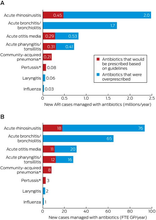 Results: An estimated mean 5.97 million (95% CI, 5.69–6.24 million) ARI cases per year were managed in Australian general practice with at least one antibiotic, equivalent to an estimated 230 cases per FTE GP/year (95% CI, 219–240 cases/FTE/year). Antibiotics are not recommended by the guidelines for acute bronchitis/bronchiolitis (current prescribing rate, 85%) or influenza (11%); they are always recommended for community-acquired pneumonia (current prescribing rate, 72%) and pertussis (71%); and they are recommended for 0.5–8% of cases of acute rhinosinusitis (current prescribing rate, 41%), 20–31% of cases of acute otitis media (89%), and 19–40% cases of acute pharyngitis or tonsillitis (94%). Had GPs adhered to the guidelines, they would have prescribed antibiotics for 0.65–1.36 million ARIs per year nationally, or at 11–23% of the current prescribing rate. Antibiotics were prescribed more frequently than recommended for acute rhinosinusitis, acute bronchitis/bronchiolitis, acute otitis media, and acute pharyngitis/tonsillitis.