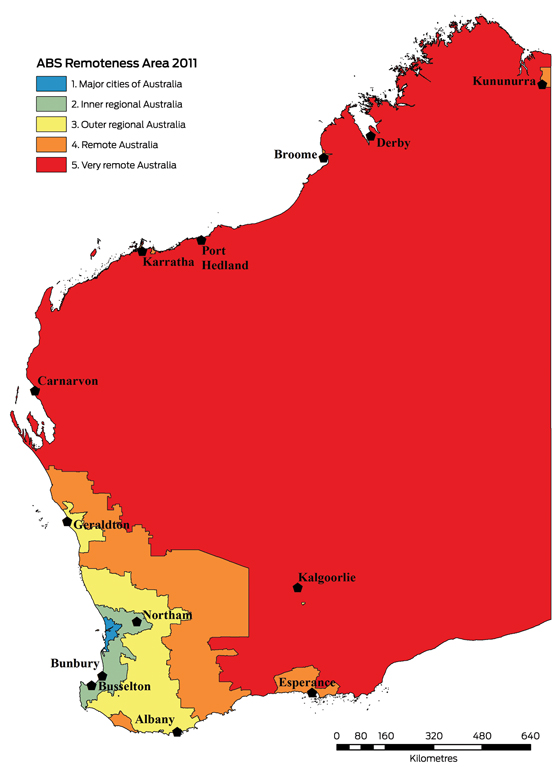Box 1 – Rural Clinical School of Western Australia sites and Australian Bureau of Statistics (ABS) Standard Geographical Classification – Remoteness Areas, 2011