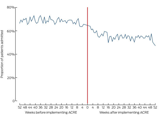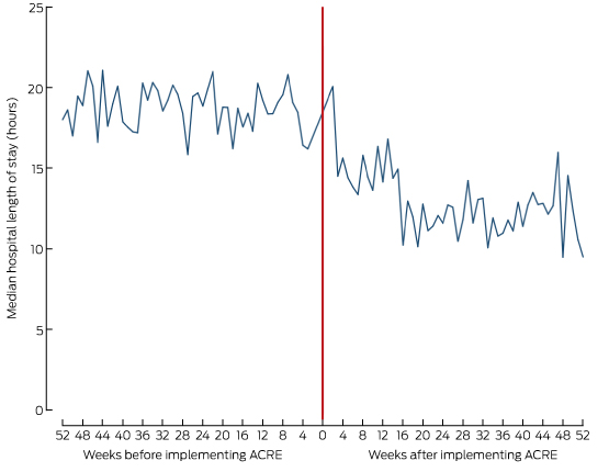 Interrupted time series analyses ensured that any differences in outcome variables before and after implementation of ACRE were not attributable to downward trends across the entire study period. Trends in hospital LOS were estimated by Prais–Winsten regression, which accounted for serial correlation across time, while also adjusting for clustering within hospitals. The median LOS by week was regressed on time (weeks from the beginning of data collection) to assess the linear trend prior to implementing ACRE. Time after implementation (weeks) was also entered to assess any change in the trend in LOS after implementing ACRE. Study period (pre- v post-implementation) was entered as a dichotomous variable to assess whether there was a quantitative change in LOS immediately after implementing ACRE. Clustered robust standard errors accounted for clustering within hospitals. A second regression compared trends in hospital admission rates; hospital admission was regressed on time, weeks after implementation, and study period.