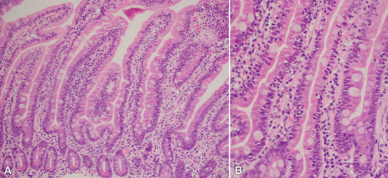 A (original magnification, × 10; haematoxylin–eosin stain) and B (original magnification, × 20; haematoxylin–eosin stain): Lymphocytic duodenosis (up to 65 intra-epithelial lymphocytes/100 enterocytes) and increased eosinophils in the lamina propria in a duodenal biopsy from a patient with non-coeliac gluten/wheat sensitivity. Intraepithelial duodenosis (≥ 25 lymphocytes per 100 enterocytes) is seen in both coeliac disease and non-coeliac gluten sensitivity, but not in functional dyspepsia.41,42 Duodenal mucosal eosinophilia is seen in both non-coeliac gluten sensitivity and functional dyspepsia.27,36