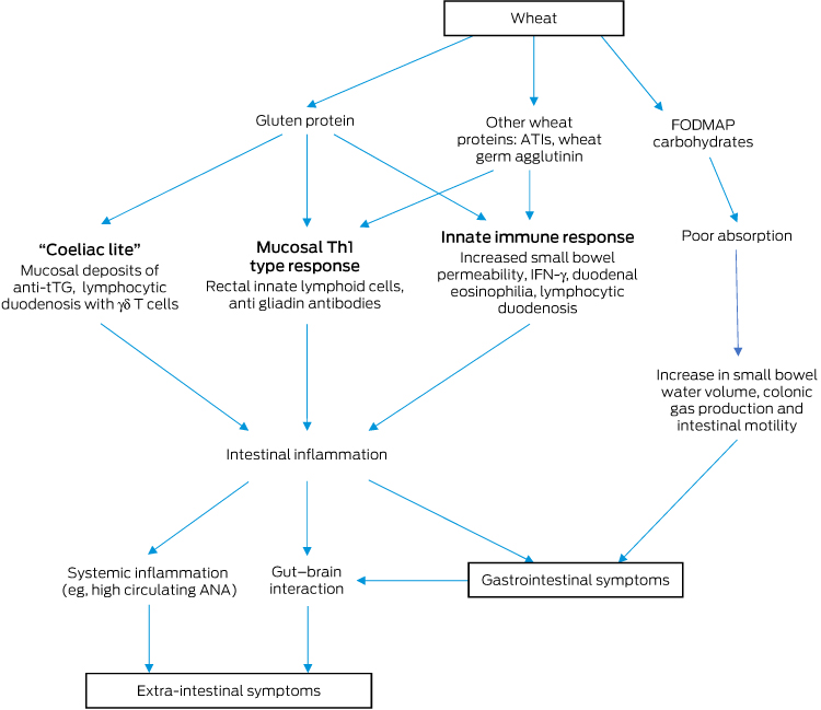 ANA = antinuclear antibody. ATI = amylase trypsin inhibitor. FODMAP = fermentable oligo-, di-, and monosaccharides and polyols. IFN = interferon. tTG = tissue transglutaminase. Ingestion of wheat exposes the intestinal mucosa to wheat proteins (gluten, ATIs, wheat germ agglutinin and other proteins) and carbohydrates (including FODMAPs). This leads to small bowel inflammation through innate and adaptive immune responses and subsequent gastrointestinal symptoms. Poor absorption of FODMAPs leads to increases in small bowel water content, colonic gas production and intestinal motility, again generating gastrointestinal symptoms.17 Subsequent systemic inflammation and possible interaction between the gastrointestinal and central nervous systems leads to generation of extra-intestinal symptoms.