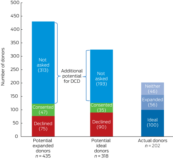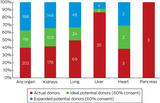 To estimate the unrealised potential pool of additional donors for DCD in Australia, we identified patients in each of the ideal and expanded potential donor groups whose families had not been approached with regard to organ donation. An identification rate of 100% and a consent rate of 60% (the consent rate in Australia in 20142) were then applied. These steps were repeated for each specific organ.