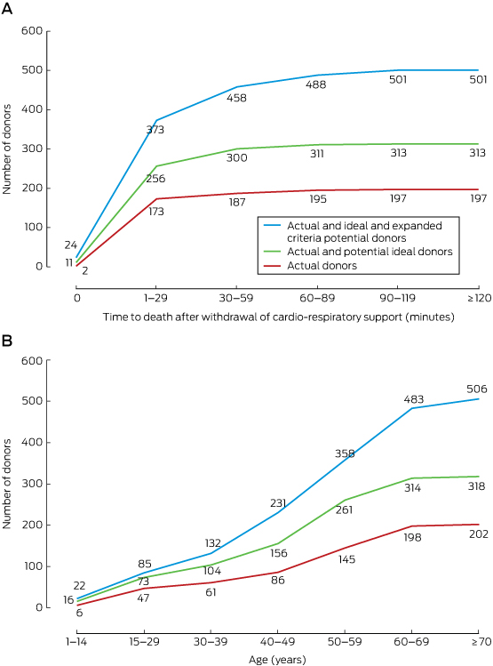 Our criteria may under- or overestimate the potential for DCD in Australia. We cannot predict how many potential DCD donors might have organs deemed medically unsuitable for transplantation; including these donors would lead to our overestimating the potential. However, given that 23% of actual DCD donors met neither ideal nor expanded criteria, it is likely there are suitable donors who also fail to meet our criteria. The low numbers of potential liver and heart DCD donors may also have been attributable to our conservative criteria. In 2014, 97% of actual donors were located in DonateLife hospitals; however, 62 adult intensive care units in Australia were not part of the network. These were predominantly small regional and private intensive care units, but also included one tertiary unit; together, they accounted for about one-third of available intensive care unit beds.24 The number of potential donors in these hospitals is unknown, possibly leading to our underestimating the full potential of DCD.