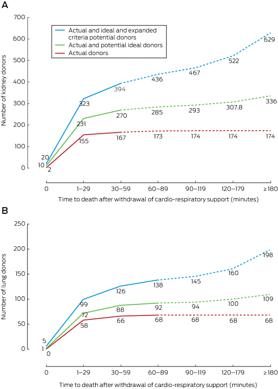 * Dotted lines indicate donation at a time point later than the ideal cut-off for time between withdrawal of support and death (60 minutes for kidneys, 90 minutes for lungs; assumed consent rate, 60%). The numbers indicate the cumulative numbers of actual and potential donors to that point on the graph.