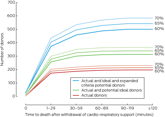 Outcomes of DCD renal and lung transplantation6,7 are similar to those for donation after brain death. Although DCD liver transplantation has been associated with primary graft dysfunction and ischaemic cholangiopathy,8,9 rates of hepatic DCD have also risen.10 Further, the first DCD heart donation programs commenced in Australia in July 2014, with good early outcomes.11,12 The full potential for increasing transplantation numbers through DCD remains unknown.