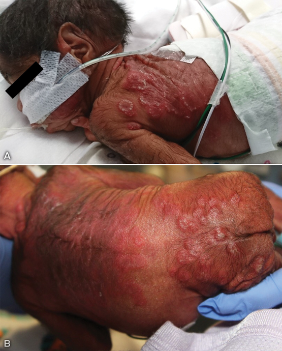 Following chorioamnionitis, a male infant from a remote Indigenous community was born by vaginal breech delivery at 26 weeks’ gestation. On Day 5, indurated, vesicular and erythematous lesions were noted on extensive areas of the back (Box, A and B). Blue light (450–475 nm) phototherapy had been commenced on Day 1 for jaundice. Further skin lesions subsequently arose on the lips, ears and scalp, and surface scale developed on established plaques. There was no major systemic disturbance.