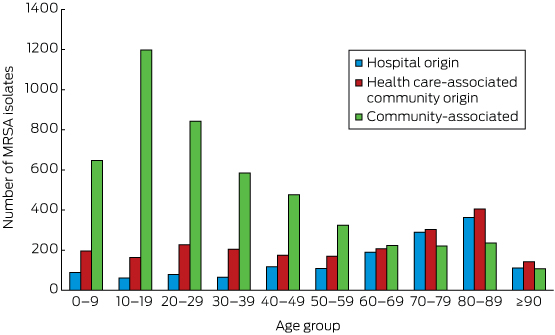 The median age of people infected with MRSA was significantly lower than for those infected with MSSA (35.8 v 47.8 years; P < 0.001); on the other hand, the proportion of MRSA isolates among those from residents of aged care facilities was higher than for the general population (36.8% v 18.6%). The proportion of MRSA isolates was also higher among Indigenous than non-Indigenous Australians (36.4% v 17.5%) (Box 2).