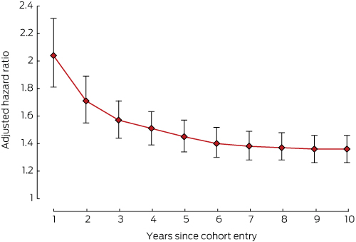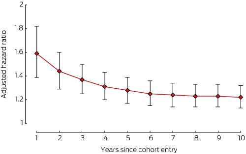 Comorbidities were identified by the medication groupings in the RxRisk-V model. We assessed the development of eight individual comorbidities that contribute to a high burden of disease in Australia:14 cardiovascular disorders (identified by medications indicated for arrhythmias, heart failure, hypertension, ischaemic heart disease, and angina, and anticoagulant and antiplatelet medicines), depression, diabetes, hyperlipidaemia, gastric acid disorders, osteoporosis, reactive airway diseases, and pain or pain–inflammation. The event was defined as the development of the comorbidity of interest in the time-to-event analysis. Women who already had a comorbidity of interest at or prior to the initiation of endocrine therapy were excluded from the relevant time-to-event analysis.