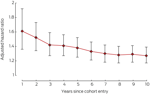 * Case numbers are available in the online Appendix, table 3. † Adjusted for the number of comorbidities at baseline; for diabetes and hyperlipidaemia, also adjusted for cardiovascular conditions at baseline; for cardiovascular disorder, also adjusted for diabetes at baseline. ‡ Overall hazard ratio (hazard ratio varied over time: Box 3, Box 4, Box 5). |