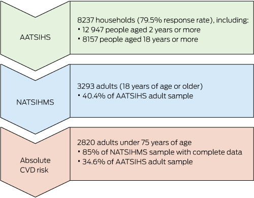 The study population comprised participants aged 18–74 years who provided biomedical data for the National Aboriginal and Torres Strait Islander Health Measures Survey (NATSIHMS) component of the Australian Bureau of Statistics (ABS) 2012–13 Australian Aboriginal and Torres Strait Islander Health Survey (AATSIHS).14 (Box 1, online Appendix).