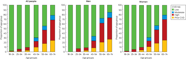 Results: Among participants aged 35–74 years, 9.6% (95% CI, 7.2–12.0%) had prior CVD; 15.7% (95% CI, 13.0–18.3%) were at high, 4.9% (95% CI, 3.3–6.6%) at moderate, and 69.8% (95% CI, 66.8–72.8%) at low absolute primary CVD risk. 82.6% of those at high primary risk were identified on the basis of clinical criteria. High primary absolute risk affected 1.1% (95% CI, 0.0–2.5%) of 18–24-year-olds, 4.7% (95% CI, 2.0–7.5%) of 25–34-year-olds, and 44.2% (95% CI, 33.1–55.3%) of 65–74-year-olds. Lipid-lowering therapy was being used by 52.9% (95% CI, 38.2–67.6%) of people aged 35–74 years with prior CVD and by 42.2% (95% CI, 30.5–53.8%) of those at high primary CVD risk.