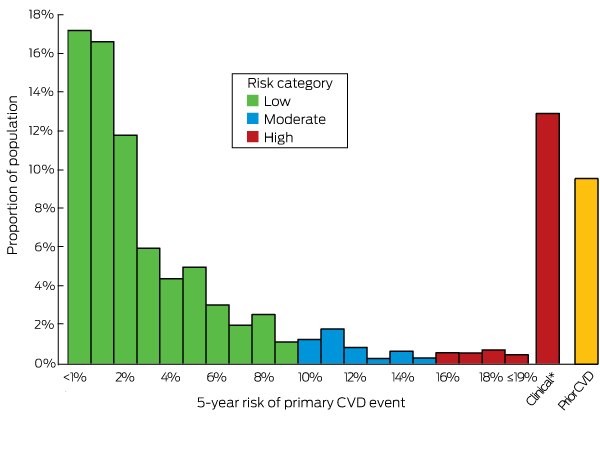 CVD mortality in Australia has declined by about 80% since peaking in 1968.8 Australian guidelines for preventing CVD and those from other countries recommend an absolute risk approach to assessment and management because it is cost-effective and is associated with less under- and overtreatment than strategies based on single risk factors.9-12 An absolute risk approach integrates data for multiple risk factors to determine an individual’s level of risk of a CVD event within a given time period.11 Best practice management of people identified as being at high absolute CVD risk — in Australia, those with a greater than 15% risk of a CVD event within 5 years according to clinical criteria or the Framingham risk equation — includes combined lipid- and blood pressure-lowering therapies and lifestyle modification.11 Population-level data on absolute CVD risk and levels of treatment can inform health care programs, policy, and planning, including that of large scale preventive treatment.13