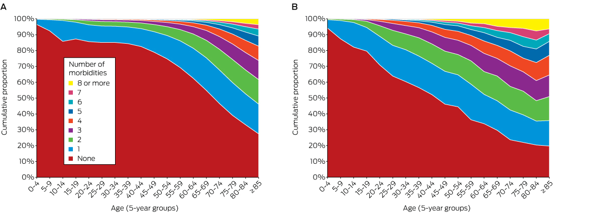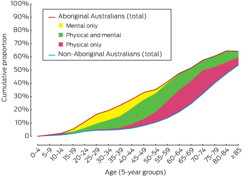 * The shaded areas between the two curves correspond to the difference between Aboriginal and non-Aboriginal Australians in the age-specific prevalence of, for example, mental multimorbidity.