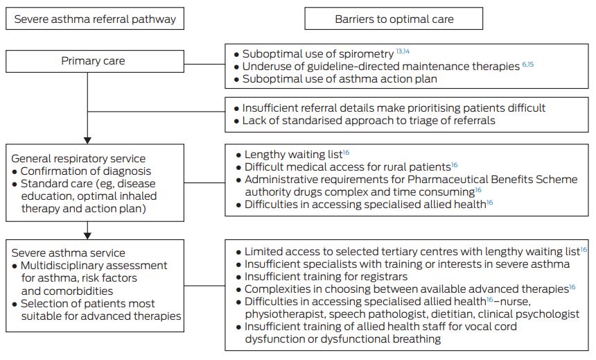 In the current climate, there are numerous barriers to achieving optimal care in Australia (Box 1).16 The asthma care for patients with milder disease in the primary care setting could be improved by increased use of spirometry, increased adherence to guideline-recommended maintenance therapy, and increased utilisation of asthma care plans; the referral process for those with severe or difficult asthma could also be streamlined by providing a detailed referral letter. For patients with asthma who live in rural or remote areas, access to hospital-based clinics may be difficult or impossible. Even within tertiary hospital settings, funding and resource limitations make it challenging to deliver the recommended multidimensional approach, often resulting in prolonged referral waiting times. It is therefore likely that a flexible approach based on effective communication and collaboration between specialists and GPs and between hospital- and community-based resources may be required.
