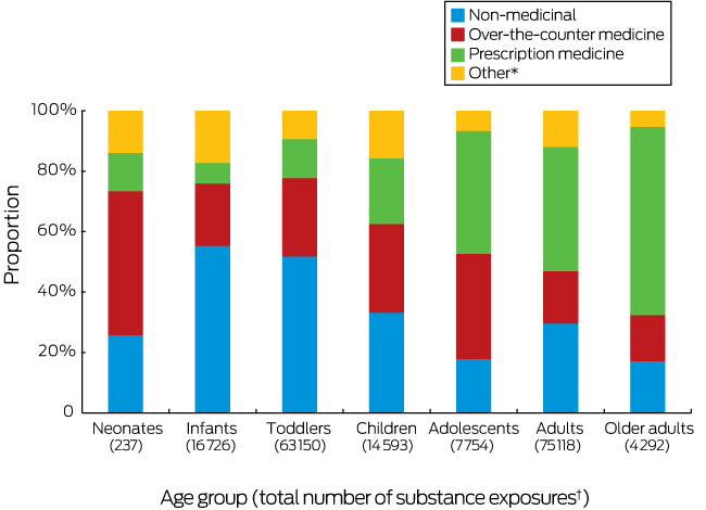 Public health initiatives for preventing poisoning must be based on evidence about the nature of exposures in the community and in hospitals. Our study provides a comprehensive overview of age group-specific patterns of poisoning exposures in Australia, based on more than three times the number of hospital cases recorded by national health statistics.5 The most likely reason for this difference is that International Classification of Disease (ICD) hospital coding captures poisoning poorly,8 and only admitted patients are assigned an ICD code (many patients are sent home after observation). ICD coding does not generally identify specific agents. The ratios of pharmaceuticals to non-pharmaceuticals in our dataset and in national admitted patient data5 were similar, but further relevant details are not collected with ICD codes. PIC data prospectively coded by specialists in poisons information provide accurate and specific substance data for both hospital and community exposures.