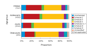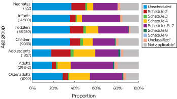 Most calls about neonates (73%), infants (76%), toddlers (78%), and children (63%) involved non-medicinal and over-the-counter medicines. The proportion of exposures related to prescription items increased with age, from 13% for neonates and 7% for infants to 62% for older adults (Box 3). Exposures to substances in Schedules 5–7 constituted the largest single category of unintentional exposures in adolescents (22%), adults (40%), and older adults (31%) (Box 4). Unintentional exposures to Schedule 3 (pharmacist-only drugs, such as cold preparations including pseudoephedrine), Schedule 8 (controlled drugs, such as oxycodone), and Schedule 9 (prohibited substances, such as heroin) were the least frequent in all age groups (Box 4). In contrast, deliberate self-poisoning predominantly involved Schedule 4 (prescription-only medicines) and Schedule 2 (pharmacy medicines) items (Box 5).