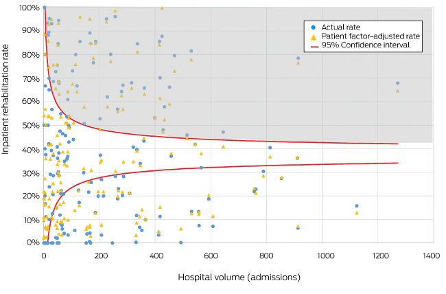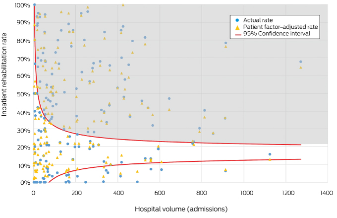 Inpatient rehabilitation referral rates in Australia during 2014–16 varied between surgeons from 0 to 100%,5 but the relevant data were not adjusted for patient characteristics that predict inpatient rehabilitation, such as age, comorbid conditions, living alone, and surgical complications.10 In Australia, routinely collected outcomes data that could be analysed to evaluate the benefits of rehabilitation are limited. The Australasian Rehabilitation Outcomes Centre (https://ahsri.uow.edu.au/aroc/index.html) records data for a functional measure after inpatient rehabilitation, but corresponding data for patients who undergo other forms of rehabilitation are not routinely collected. As an alternative approach, Duckett and colleagues11 have promoted analysis of variation for similar patients at the hospital level; variation at this level that persists after adjusting for patient factors may indicate low value care.