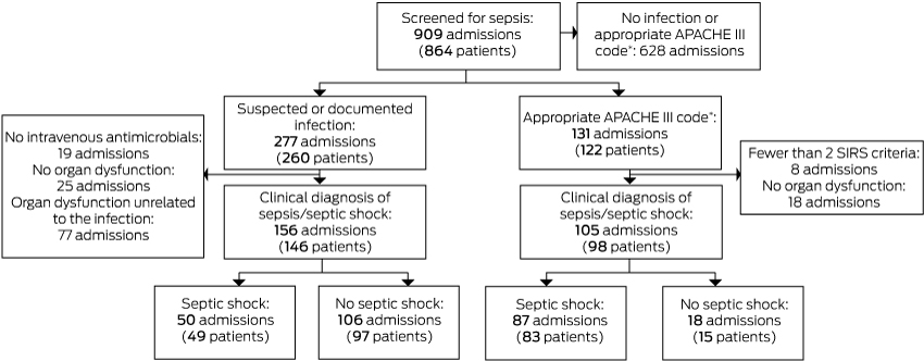 Our study was conducted in the 60-bed multidisciplinary ICU at the Royal North Shore Hospital in Sydney. All patients 18 years old or more admitted to the ICU during 1 October – 31 December 2016 were screened daily by two members of the research team (MH, MS) for clinical diagnoses of sepsis or septic shock. They were also assessed with the ANZICS CORE criteria for sepsis and septic shock.
