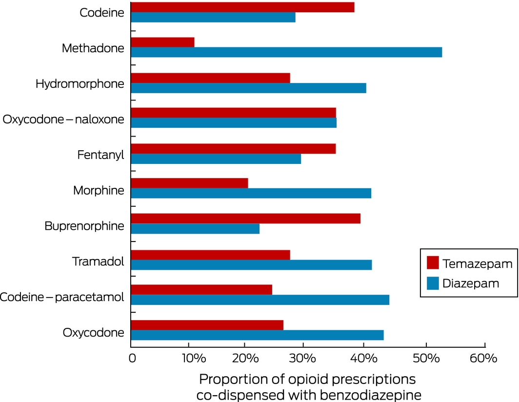 The number of people concomitantly dispensed benzodiazepines and opioids declined from 93 630 (14.8% of people dispensed opioids) in July 2012 to 91 550 (12.7%) in June 2017, a mean annual decrease of 3.4% (RR, 0.97; 95% CI, 0.96–0.97). The mean age of people dispensed both drug types in July 2017 was 59 years (standard deviation, 18 years); 14% of concomitant dispensees were aged 40 years or less, 36% 41–60 years, and 50% were over 60; 54 930 (60%) were women. The dispensing overlap was less than a week for 19 042 people (20.8%), at least 7 days but less than a month for 61 064 (66.7%), and a full month for 11 444 (12.5%). Codeine–paracetamol (26.2% of opioid medications dispensed) and oxycodone (24.9%) were the two most frequently dispensed opioid medications; diazepam (38.5%) and temazepam (33.8%) the most frequently dispensed benzodiazepines (Box 1). Concomitant dispensing of individual opioids with diazepam ranged from 22% to 53%, and with temazepam from 11% to 39% (Box 2).