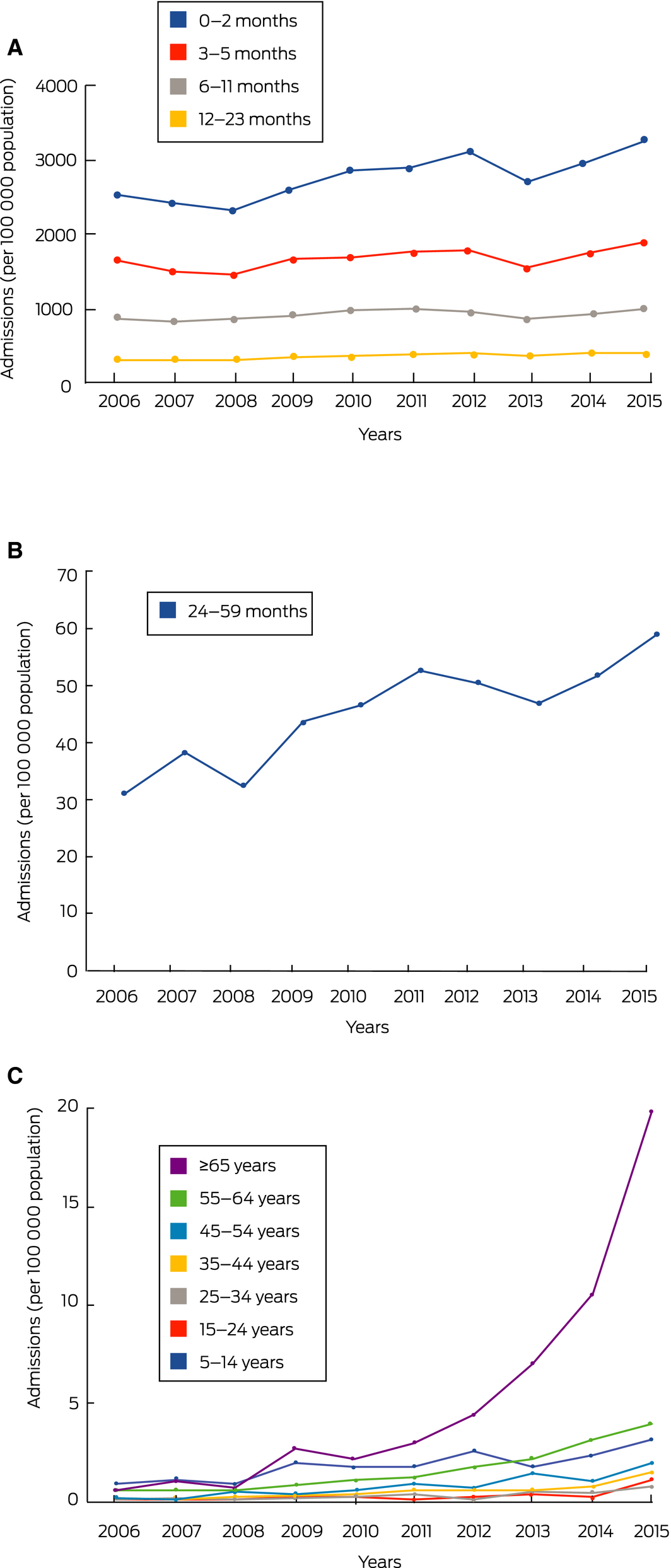 The hospitalisation rates for young children were fairly constant across the study period. The hospitalisation rate for adults over 65 increased from one per 100 000 population in 2006 to 20 per 100 000 population in 2015. There were smaller rises in older children and other adult age groups (Box 2). The hospitalisation rate was higher for adults aged 65 or more than for people aged 5–64 years (IRR, 6.6; 95% CI, 6.2–7.1).