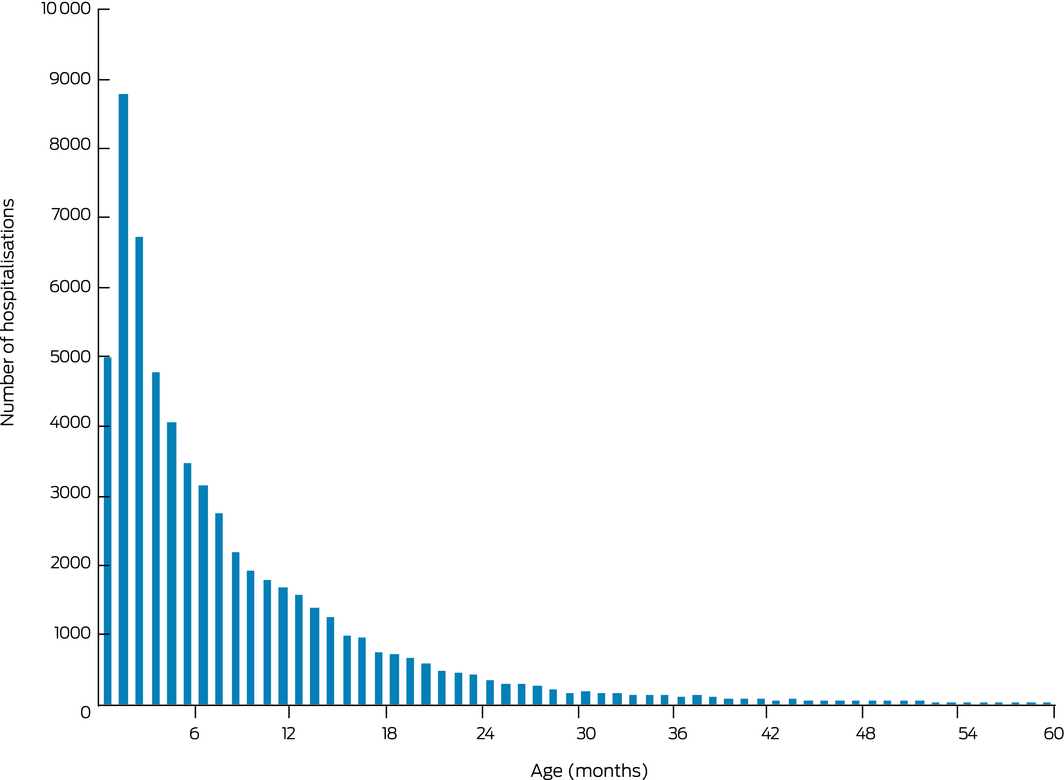 The numbers of hospitalisations of children under 5 years of age with an RSV code peaked at one month of age, then declined with age (Box 3).