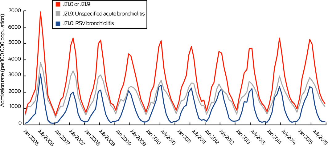 De‐identified national hospitalisation data for the period 1 January 2006 – 31 December 2015 were obtained from the Australian Institute of Health and Welfare National Hospital Morbidity Database. We extracted hospitalisations with International Classification of Diseases, tenth revision, Australian modification (ICD‐10‐AM) diagnosis codes for RSV pneumonia (J12.1), RSV bronchitis (J20.5), RSV bronchiolitis (J21.0), and RSV as the cause of diseases classified to other chapters (RSV organism) (B97.4). These codes were selected on the basis of earlier studies6,10,12,13 and expert opinion. Hospitalisations of children under 24 months of age with a principal diagnosis code of unspecified acute bronchiolitis (J21.9) were also extracted, as this diagnosis is frequently associated with RSV disease.14,15 Hospitalisation data for Aboriginal and Torres Strait Islander (Indigenous) Australians were also separately analysed from 2011 onwards, when completeness of Indigenous identification was considered adequate in all jurisdictions.16 Mid‐year population estimates for Australia, by state and territory (jurisdiction), sex, and age, were based upon Australian Bureau of Statistics census estimates for 2016 (Australia)17 or 2011 (Indigenous Australians).18