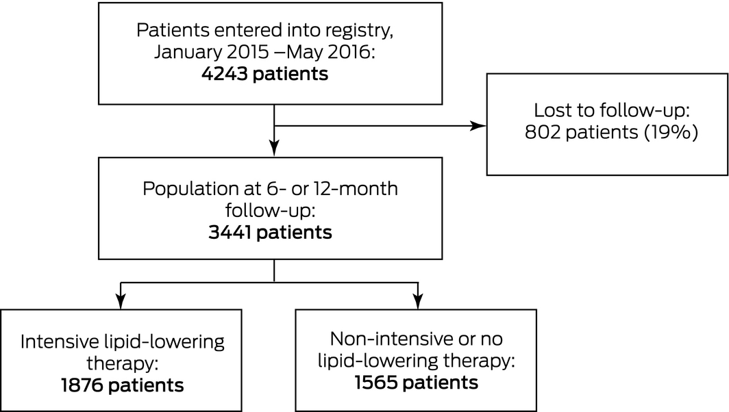 The endpoint of interest was whether a patient received intensive lipid‐lowering therapy, defined as treatment with atorvastatin (≥ 40 mg/day), rosuvastatin (≥ 20 mg/day), or simvastatin (≥ 80 mg/day), with or without ezetimibe; lower intensity statin therapy with ezetimibe; or ezetimibe alone. The cited statin doses were based on the American College of Cardiology/American Heart Association classification of intensity,12 with the exception of simvastatin at 80 mg/day or more; although it has been evaluated in randomised controlled trials, simvastatin is not recommended in the United States because of the increased risk of myopathy, including rhabdomyolysis. The advice in Australian prescribing information is that simvastatin at 80 mg/day should be prescribed only for patients at high risk of coronary events who have not achieved their treatment goals on lower doses.