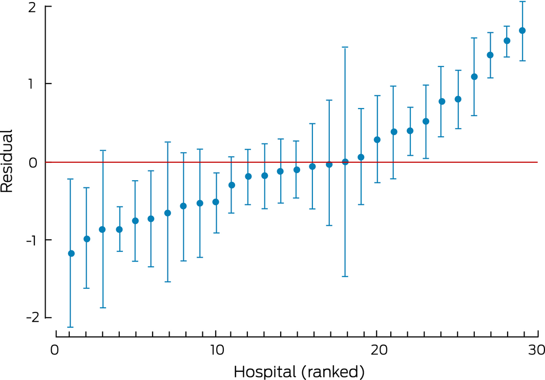 Independent variables from the final generalised linear model in the GEE framework were also included in a multilevel mixed model for determining the variance partition coefficient, which describes the proportion of the residual variation in the propensity to not being prescribed intensive lipid‐lowering therapy at the most recent follow‐up that is attributable to unmeasured hospital characteristics. This was depicted in a caterpillar plot of hospital residuals with 95% CIs. The hospital residuals represent departures from the overall mean; a hospital with a 95% CI that does not include zero (the mean log‐odds of not being prescribed intensive lipid‐lowering therapy at 6–12 months after the index admission for ACS) was deemed to differ significantly from the overall mean for all hospitals.