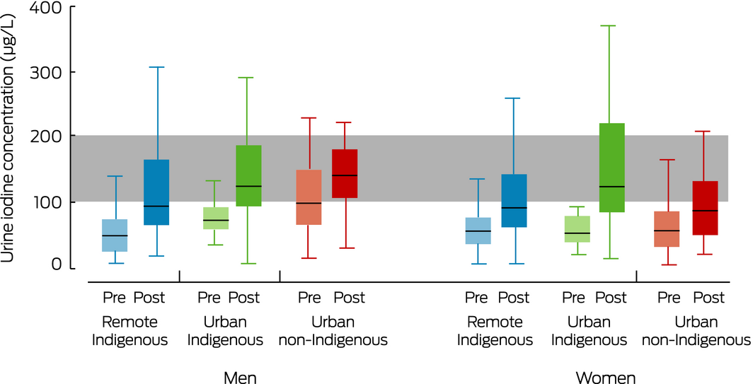 The new: The median urinary iodine concentration of 368 young Northern Territory residents increased from 58 μg/L (interquartile range [IQR], 35–83 μg/L) to 101 μg/L (IQR, 66–163 μg/L) after fortification became mandatory. Urban Indigenous and non‐Indigenous participants achieved adequate iodine levels, but remote Indigenous and urban non‐Indigenous women were still mildly iodine‐deficient.