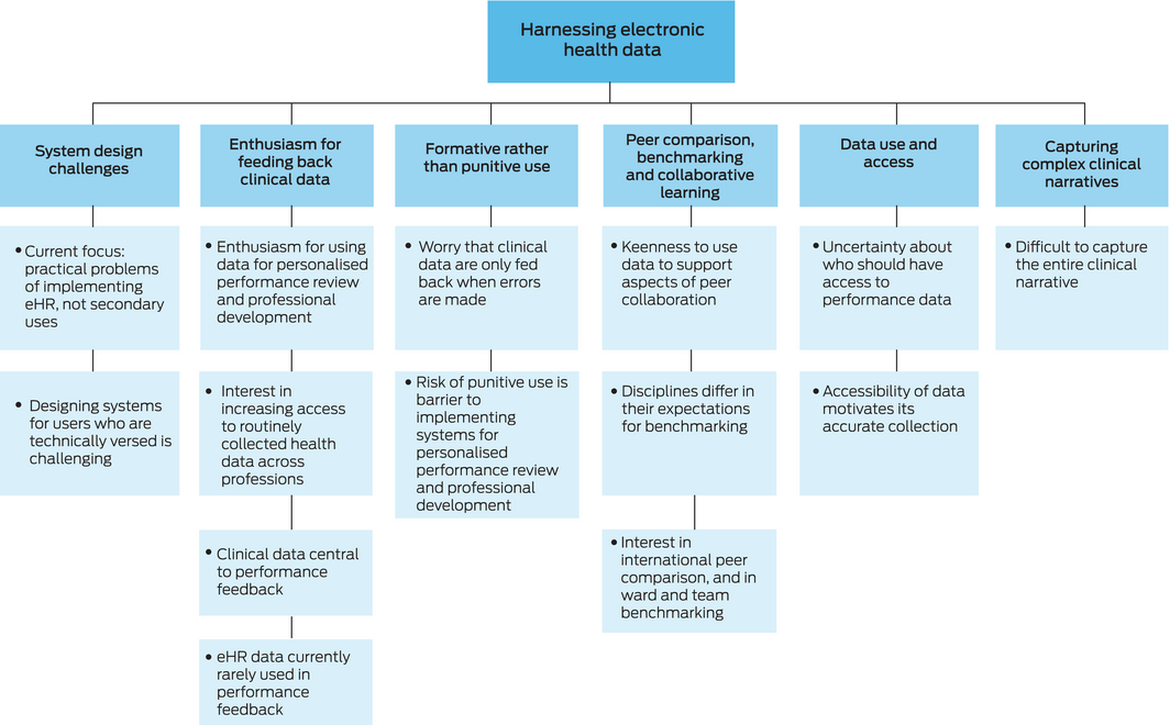 Our findings provide insights into the barriers to and facilitators of designing programs that support more sophisticated integration of data into interventions aimed at changing the behaviour of health professionals. Unsurprisingly, anxiety about who can access data related to clinical performance and the use of such data for evaluative purposes was a key reservation for participants in all workshops. This is a challenging problem, as managers will feel obliged to react to information about poor performance by clinicians in order to reduce the risk to patient care. It will be difficult for organisations to leave the resolution of identified performance deficits to professional development processes alone, given the effects the problems may have on patient experiences or outcomes of care. These barriers need to be overcome by applying user‐centred design principles and collaboration between clinical professionals and safety and quality regulators for co‐designing such programs. New procedures that enable the secondary use of eHR data should be implemented, including governance structures and tools for rapidly identifying data suitable for performance feedback. Any systems developed will naturally need to comply with local regulations and standards regarding privacy and consent. The types of protection related to disclosure that apply to mortality and morbidity meetings may perhaps be adapted for use in this context.24