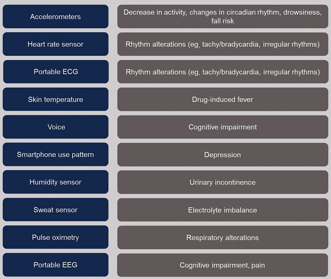 Box – Non‐exhaustive list of wearable sensors and clinical alterations they can detect, according to currently published scientific literature5,6,7,8,9,10,11,12,13,14,15,16,17,18
