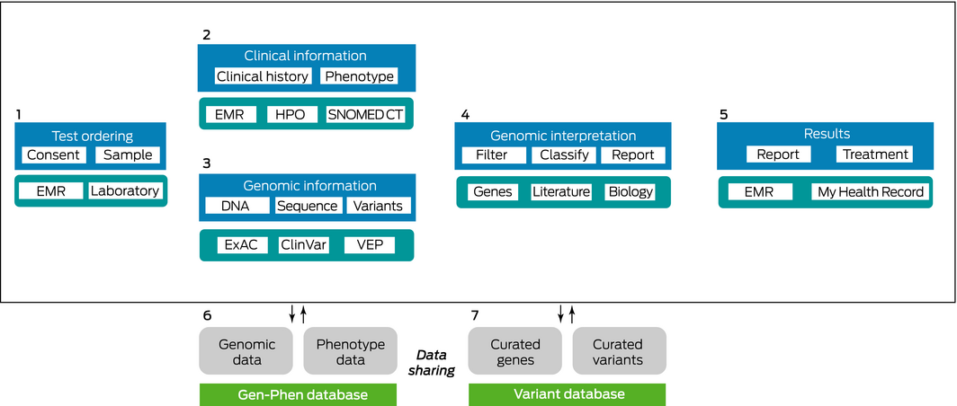 The flow of genomic data can be broken down into seven phases, shown in the Box. Phase 1 involves acquiring patient samples, with patient consent, in accredited clinical laboratories. This leads to phases 2 and 3, which happen in parallel. Phase 2 involves capturing relevant clinical information in electronic medical records using standardised terminology such as SNOMED CT and HPO, and phase 3 involves generating genomic information annotated with public information from sources such as ClinVar or the Exome Aggregation Consortium using tools such as Variant Effect Predictor. Phase 4 is the manual review and curation of annotated genomic changes relevant to the patient's phenotype. Phase 5 is generation of clinical reports for return to the electronic medical record and sharing via My Health Record. Phases 6 and 7 involve capturing generated results, annotation and relationships in dedicated databases for re‐use.