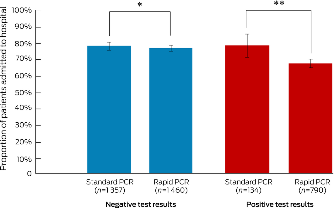 Of the 452 patients under 18 years of age in the standard PCR group, 301 (66.6%; 95% CI, 62.0–70.9%) were admitted to hospital, as were 158 of the 312 children (50.6%; 95% CI, 44.9–56.3%) in the rapid PCR group (standard v rapid PCR: aOR, 1.7; 95% CI, 1.3–2.4). Of the 670 patients over 60 years of age in the standard PCR group, 615 (91.8%; 95%, 89.4–93.8%) were admitted to hospital, as were 1167 of the 1384 patients of this age (84.3%; 95% CI, 82.3–86.2%) in the rapid PCR group (standard v rapid PCR: aOR, 2.1; 95% CI, 1.5–2.9) (Supporting Information, figure 1).