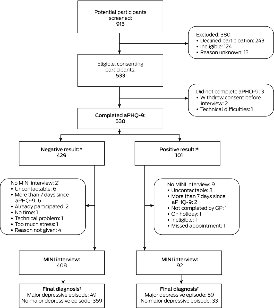 Between 25 March 2015 and 2 November 2016, 913 people were screened for eligibility, of whom 533 provided informed consent; 530 participants completed the aPHQ‐9, of whom 500 also completed the clinical MINI interview (Box 1). There were no differences in baseline characteristics between these participants and the 30 who did not complete the PHQ‐9 and MINI (data not shown).