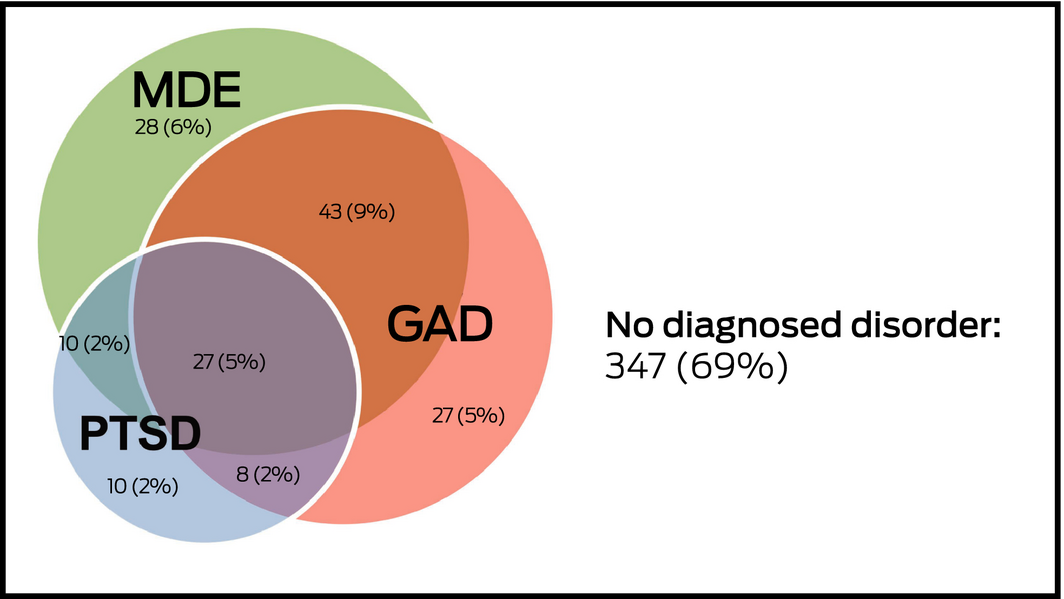 The prevalence of a current major depressive episode according to the MINI criterion was 22% (95% CI, 18–25%), of generalised anxiety disorder 21% (95% CI, 18–25%), and of post‐traumatic stress disorder 11% (95% CI, 8–14%). No MINI diagnosis was made for 347 participants (69%), while 27 participants (5%) met diagnostic criteria for all three conditions (Box 4). There were statistically significant associations between having a current major depressive episode and arthritis, asthma, obstructive sleep apnoea, having an illness that restricted activities of daily living in the preceding two months, and having been previously diagnosed with depression or anxiety (Box 2, Box 3).