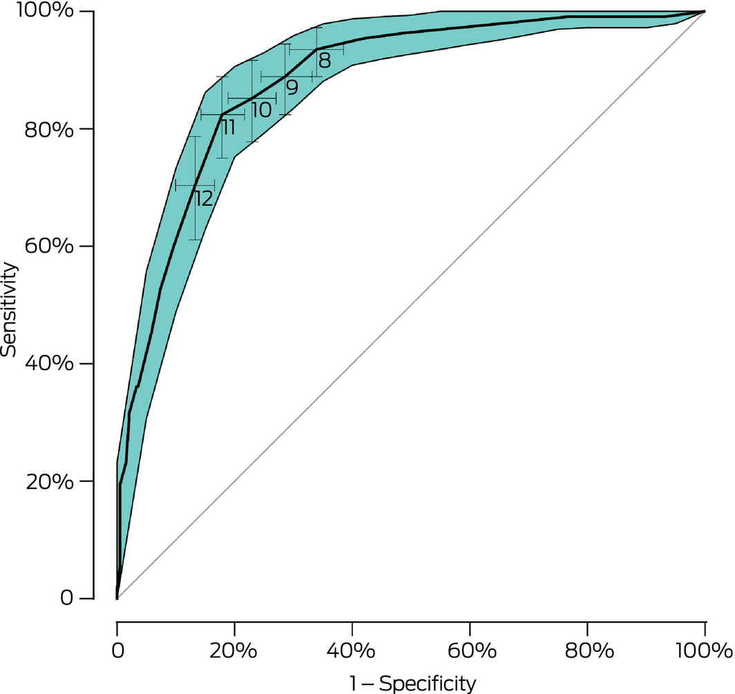 For screening for a current major depressive episode (criterion II), the area under the ROC curve was 0.88 (95% CI, 0.85–0.92). The sensitivity with a cut‐point of 10 was 84% (95% CI, 74–91%) and the specificity 77% (95% CI, 71–83%); with a cut‐point of 9, the sensitivity was 87% (95% CI, 78–93%) and the specificity 72% (95% CI, 66–77%), and with a cut‐point of 11 the sensitivity was 81% (95% CI, 79–89%) and the specificity 82% (95% CI, 77–87%) (Box 5, Box 6). The estimates were nearly identical if the three incomplete aPHQ‐9 questionnaires were excluded from the analysis (data not shown).