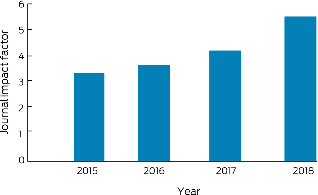 The Medical Journal of Australia (MJA) is Australia's leading peer‐reviewed medical journal, and internationally ranks 16th among general medical journals by impact factor.2 It is therefore very pleasing to announce that the Journal Impact Factor for the MJA in 2018 has increased, for the third consecutive year, to 5.332 (2018 Journal Impact Factor, Journal Citation Reports [Web of Science Group, 2019]), the Journal's highest impact factor ever (Box 1).